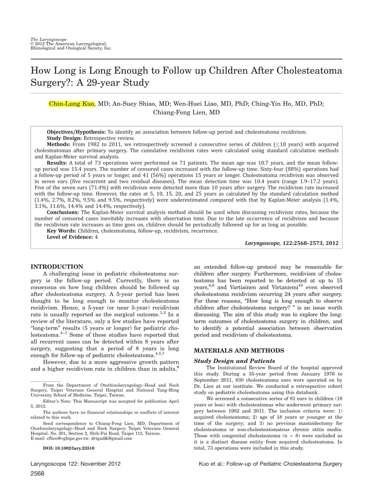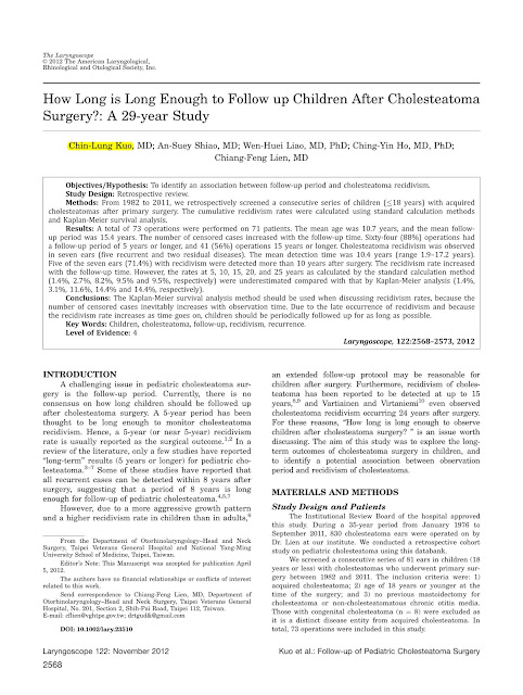 陽明大學腦科學博士/國軍桃園總醫院耳鼻喉科主任 郭錦龍 醫師本人所著有關「兒童膽脂瘤29年追蹤報告」一文(The Laryngoscope, 122:2568-2573, 2012)於2013年被國際權威論文推薦網站「F1000Prime」評選為值得推薦閱讀之論文。...